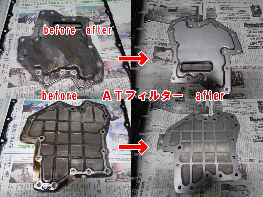 走行距離が長い車両では、ATフィルターの清掃やオイル受け皿の鉄粉除去など、汚れた部分をしっかりクリーニング!